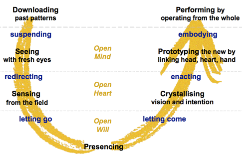 In Theory U wordt beschreven dat, om te weten te komen wat de toekomst van je vraagt, het essentieel is om je te openen. Je opent je mind, zodat je met nieuwe ogen kunt kijken: “Hee, wat we doen is eigenlijk niet meer wat er nodig is!”